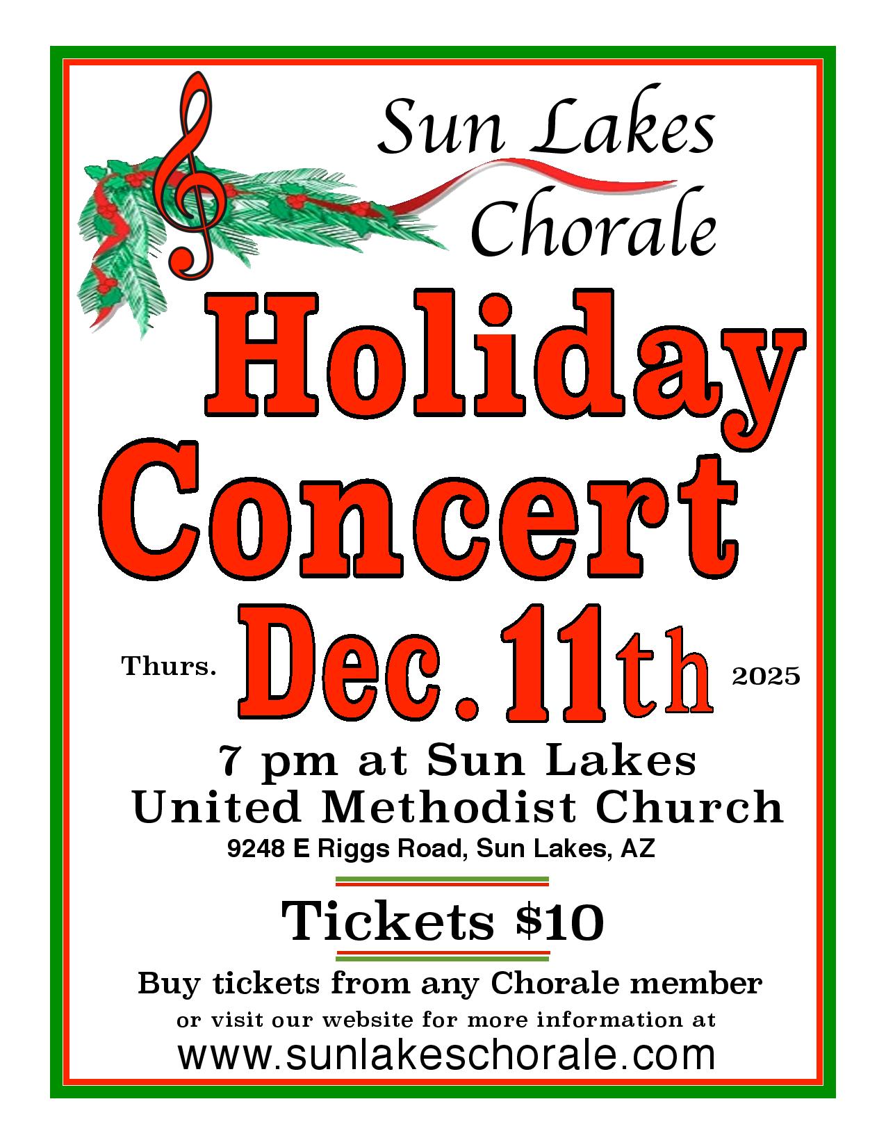 The Sun Lakes Chorale is a four-part chorus organized for the purpose of bringing together those residents of Sun Lakes who perform for their own enjoyment through two concerts a year, providing a forum for quality presentations of choral music to the public.
